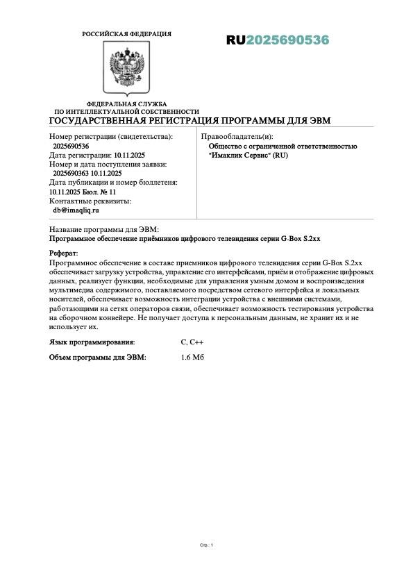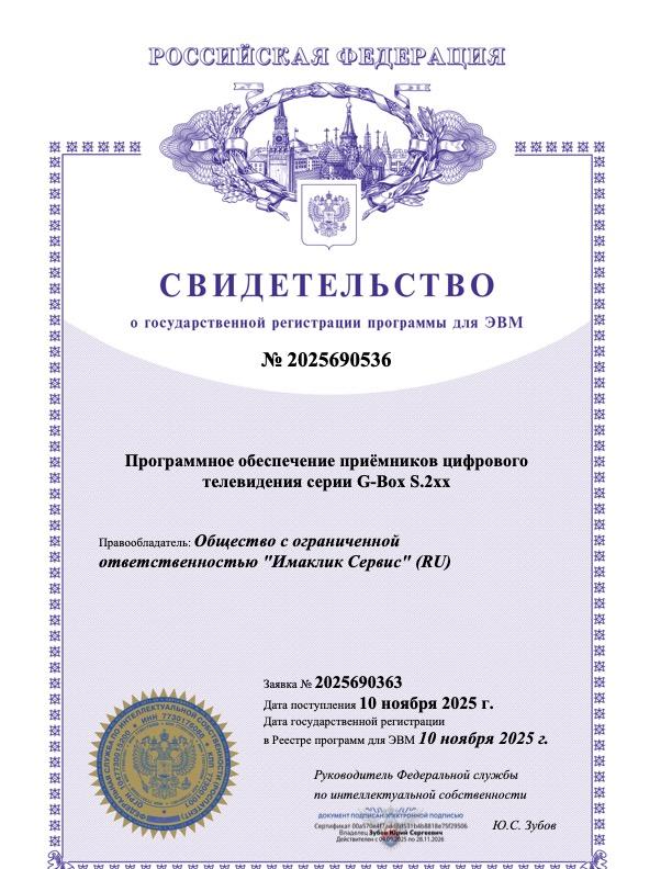 Свидетельство о регистрации в Роспатенте ПО приёмников цифрового телевидения серии G-Box S.2xx