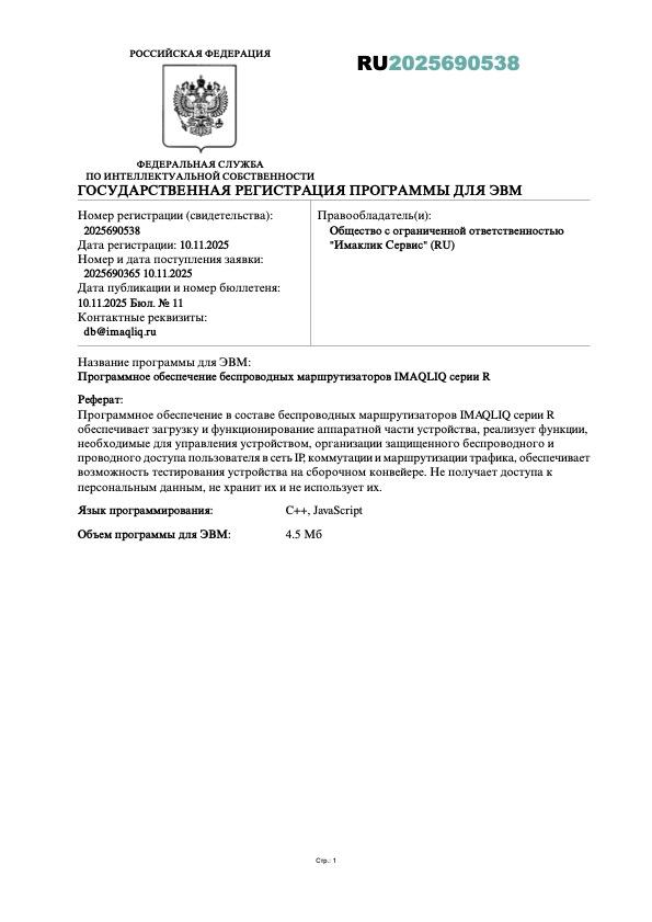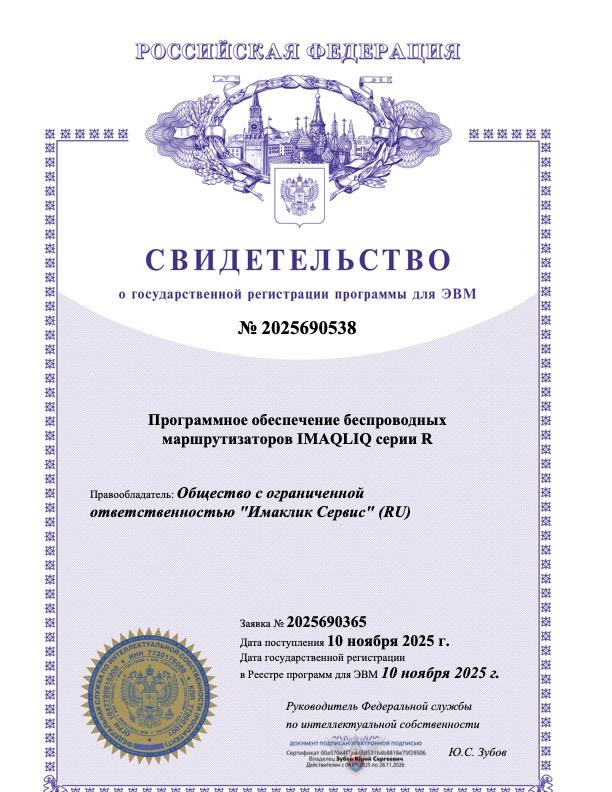 Свидетельство о регистрации в Роспатенте ПО беспроводных маршрутизаторов IMAQLIQ серии R